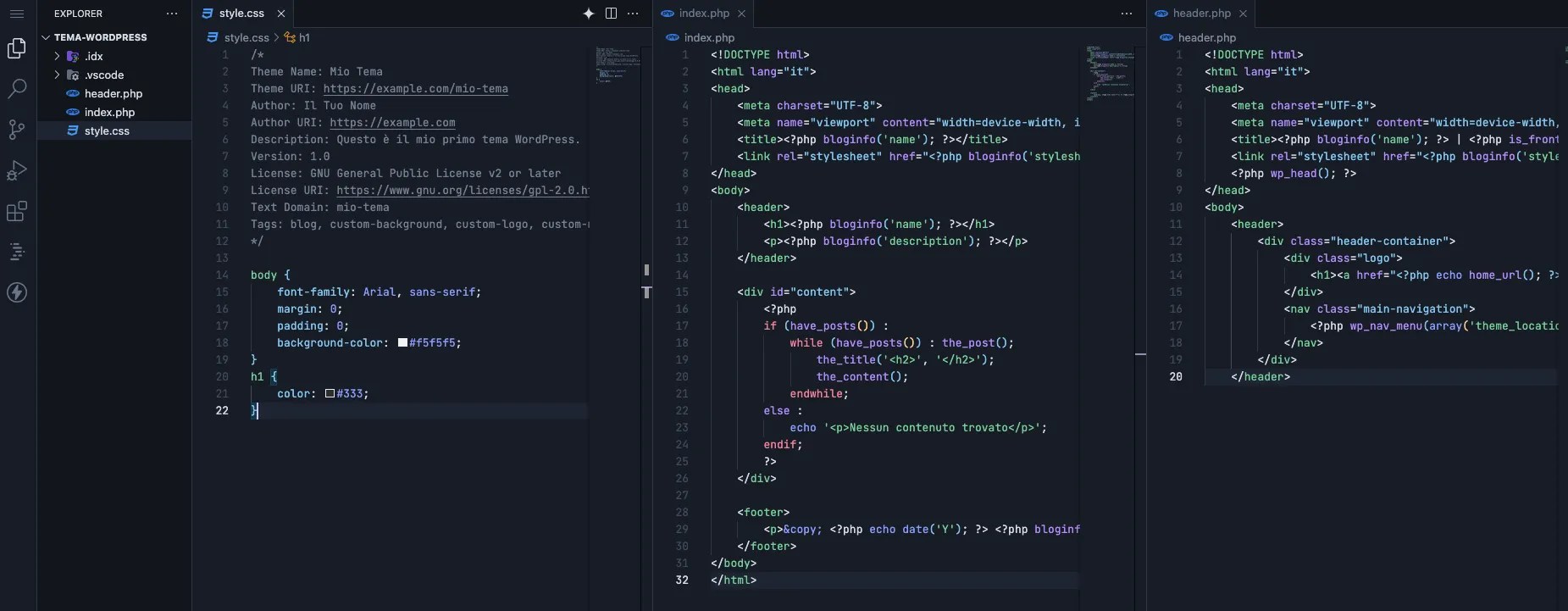 style.css:/* Theme Name: Mio Tema Theme URI: https://example.com/mio-tema Author: Il Tuo Nome Author URI: https://example.com Description: Questo è il mio primo tema WordPress. Version: 1.0 License: GNU General Public License v2 or later License URI: https://www.gnu.org/licenses/gpl-2.0.html Text Domain: mio-tema Tags: blog, custom-background, custom-logo, custom-menu */ - Aggiungi le Regole di Stile: Successivamente, puoi aggiungere le regole CSS per il tuo tema. Ad esempio: